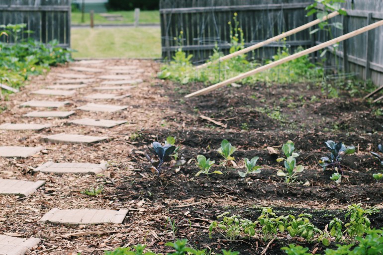 After weeding, we got to work planning the space and getting transplants in the ground, as well as direct-seeding crops. We also starting preparing and laying a whimsical garden path, one of my favorite parts of this project.